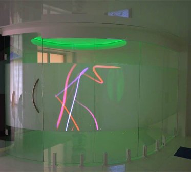 เมื่อเปิดเครื่องโมเลกุลของผลึกเหลวจะถูกจัดเรียงอย่างเป็นระเบียบ ทำให้ฟิล์ม PDLC โปร่งใส